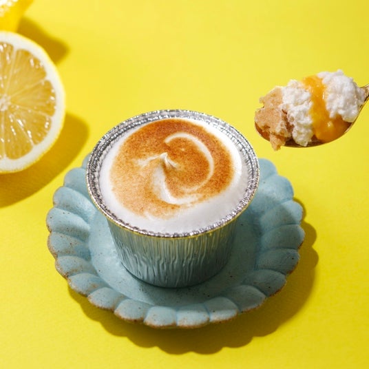 イタリアンメレンゲ、レモンクリーム、ホイップクリーム、練りパイの4層仕立てのスイーツ。