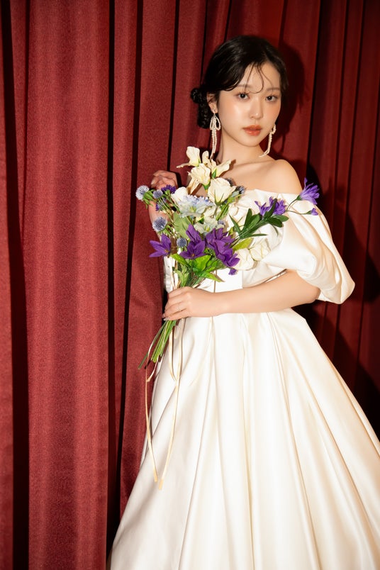 パールのような上質な艶を放つドレスはパフスリーブでスタイルカバーを叶え柔らかい印象に。