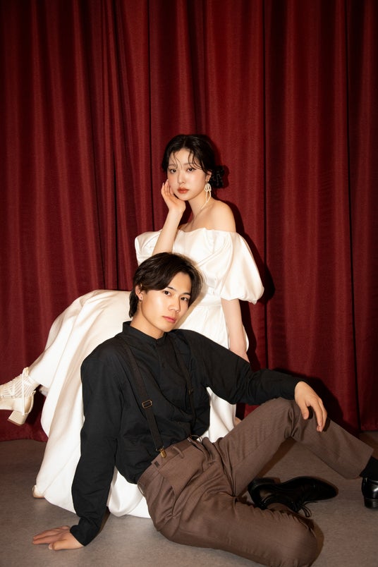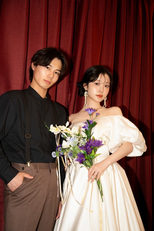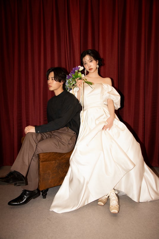 情熱と上品さを表現する赤色のカーテンはアンティークなスタイルに大人感を演出。フラッシュを焚いたようなレトロ感がパールやリボンの艶めきと融合しアンティークな質感を底上げする。