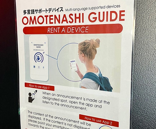 スマートフォンに「おもてなしガイド」アプリを事前にダウンロードし、お手持ちのイヤホンから映像コンテンツに連動したナレーションを、選択した言語で楽しめます。
