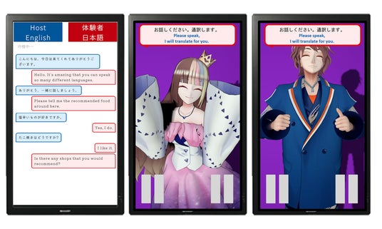 当機能は、多言語翻訳技術とキャラクターを融合させ、世界各国の来場者とのコミュニケーションやスタッフとのやり取りなどの多言語コミュニケーションをインターネットの接続なしでサポートするものです。スクリーンに投影されたキャラクターを通訳者として、異なる言語の人同士が円滑な会話やコミュニケーションを行えます。キャラクターは、イベント会場や展示ブースをはじめ、商業施設、駅、自治体の窓口、オフィスなど設置する場所に応じてサイネージやタブレット、PCなど、さまざまなデバイスで表示できます。キャラクターによる音声通訳のほか、キャラクターを使わずに文字のみ表示することもできます。今後は、通訳以外にも、対話型の多言語応答などの機能拡張を検討しています。