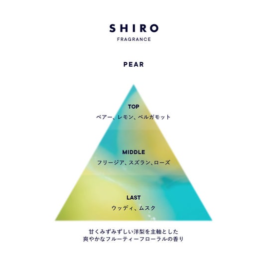 やさしい甘さをもつ上品なペアーの香りをまとえるオードパルファン。ひと吹きするたび、みずみずしい果実とエレガントな花々の香りに包まれます。お客様からの人気が高く、SHIRO のスタッフにもファンが多いフレグランスです。つける部位によって香り方が変化するので、その日の気分やお好みで使い分けてお楽しみください。