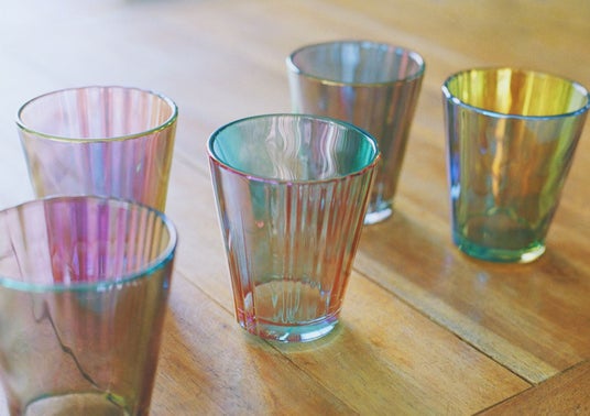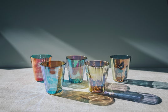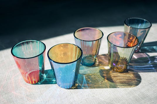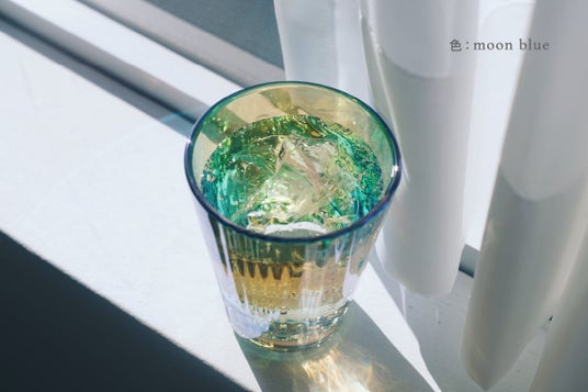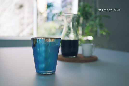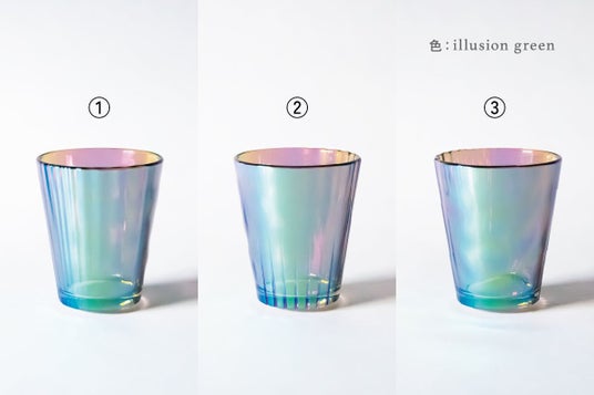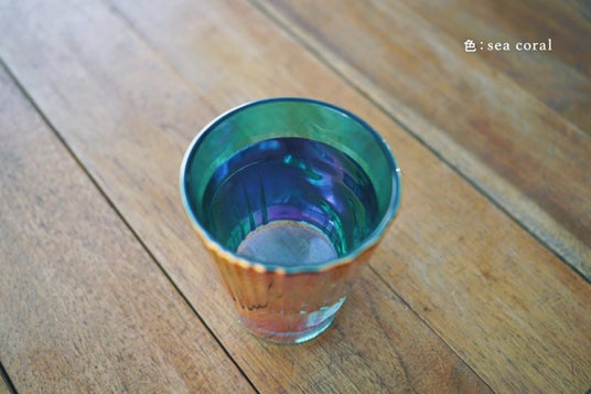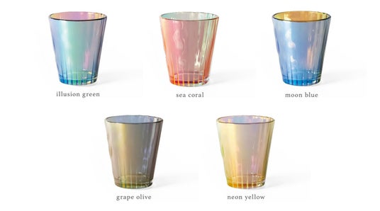 yura glassは、ガラスの表面へ 100 万分 の 1 ミリ単位でコントロールされた薄い膜をコーティングする蒸着技術によって、光の干渉を利用した不思議な色を生み出し、光の当たり方や見る角度、背景の色によってさまざまな色味に変化します。思わず時間を忘れて眺めたくなる美しさを楽しめます。