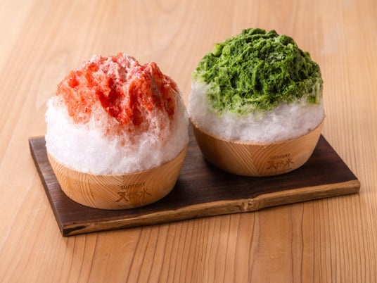 「SUNTORY PARK CAFE」の看板メニューである「サントリー天然水のかき氷」は、創業20年を超える湘南の名店「埜庵(のあん)」監修のプレミアムかき氷です。雄大な山々で長い歳月をかけて育まれた「サントリー天然水」でつくったふわふわの口当たりが特長で、「苺みるく」と「抹茶みるく」の2種類のこだわりシロップをご用意しています。