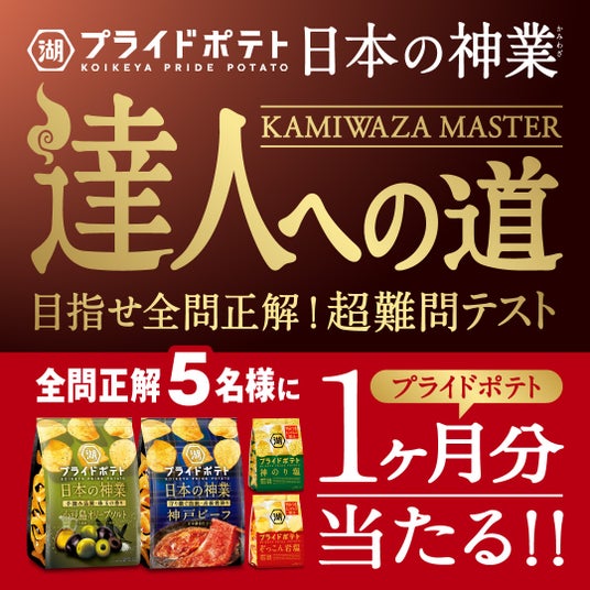 株式会社湖池屋(社長:佐藤章)は、世界から注目を集める“日本産食材の魅力”を支える匠の技と情熱の結晶である“日本の神業”を中核とした「湖池屋プライドポテト 日本の神業」シリーズの2025年度第1弾商品として「小豆島オリーブソルト」「神戸ビーフ」を発売することを記念し、「湖池屋プライドポテト」の詰め合わせが当たるキャンペーン“日本の神業~達人への道~”を実施します。