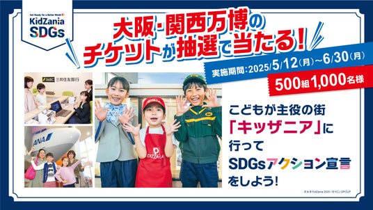 こどもの職業・社会体験施設「キッザニア」の企画・運営を行う KCJ GROUP 株式会社(本社:東京都 中央区、代表取締役社長:圓谷 道成、以下 KCJ GROUP)は、「キッザニア東京」(東京都江東区)「キッ ザニア甲子園」(兵庫県西宮市)「キッザニア福岡」(福岡県福岡市)の「SDGs センター」において、こど も達自身が未来のために取り組みたい「SDGs アクション宣言」をすると、大阪・関西万博のチケットが 抽選で当たるキャンペーンを、2025 年 5 月 12 日(月)から 6 月 30 日(月)まで実施いたします。