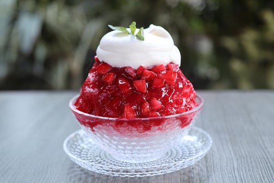 氷は明治33年に創業した宮下製氷冷蔵の地下深くの帯水層から汲み上げた信州深層天然水を使用。これを雪のようにふんわりと削り出します。フレーバーは北海道産あずきと宇治抹茶や、自家製フルーツソース練乳クリーム仕立てなどからお選びいただけます。