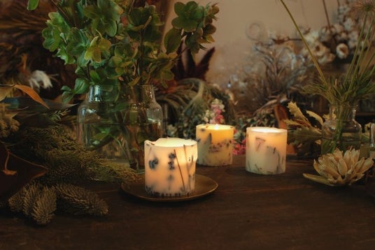 お花をあしらったソイキャンドル。一つひとつに個性がある花だからこそ、灯をともすと、その時にしかできないデザインの影絵が浮かび上がり、時間とともに変化していきます。