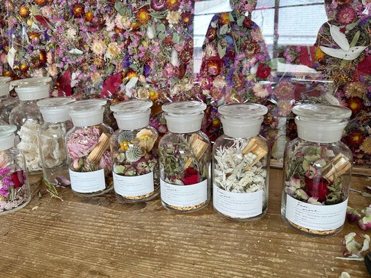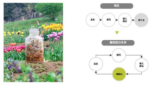 瓶内で花が微生物によって分解されていく様子を観察することのできるアート作品「フラワーコンポスト」を店内に設置。ぜひ皆さんも、お手持ちのお花を入れて循環に参加してみてください。