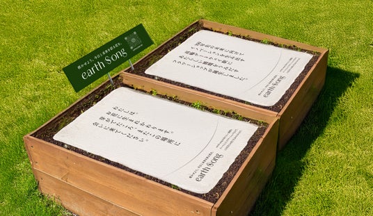 紙にお花の種がすきこまれた「シードペーパー」を活用したearth songオリジナルの案内看板。紙からはやがて芽が生え、お花が咲きます。