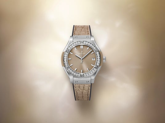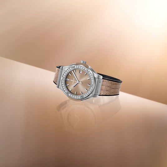 「クラシック・フュージョン チタニウム トープ ダイヤモンド」は、ウブロのレディスウォッチの中でも高い人気を誇る「クラシック・フュージョン」の33mmケースサイズに登場した新作です。ダイアルとストラップには、ブランド初となる新たなニュアンスカラー「トープ」を採用しました。ブラウン、グレー、そしてベージュのエッセンスを感じさせる品格と洗練を兼ね備えた印象的な色は、「クラシック・フュージョン」のシンプルで現代的なデザインと 美しく調和しています。