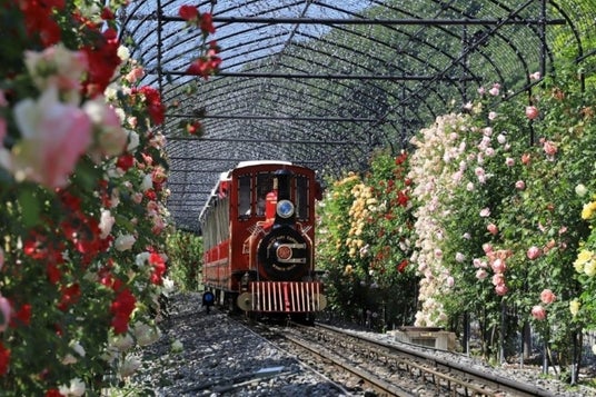 約100m続くバラのトンネル。電車(有料)に乗ってゆっくりと楽しむのがお勧めです!@ローザン鉄道ミルキーウェイ