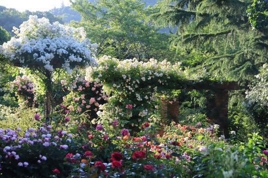 周りの山々も借景にした風景は圧巻です。アンブレラのようにバラが仕立てられています。また小さな小道がいくつもあり、思い思いにガーデン散策をお楽しみいただけます。