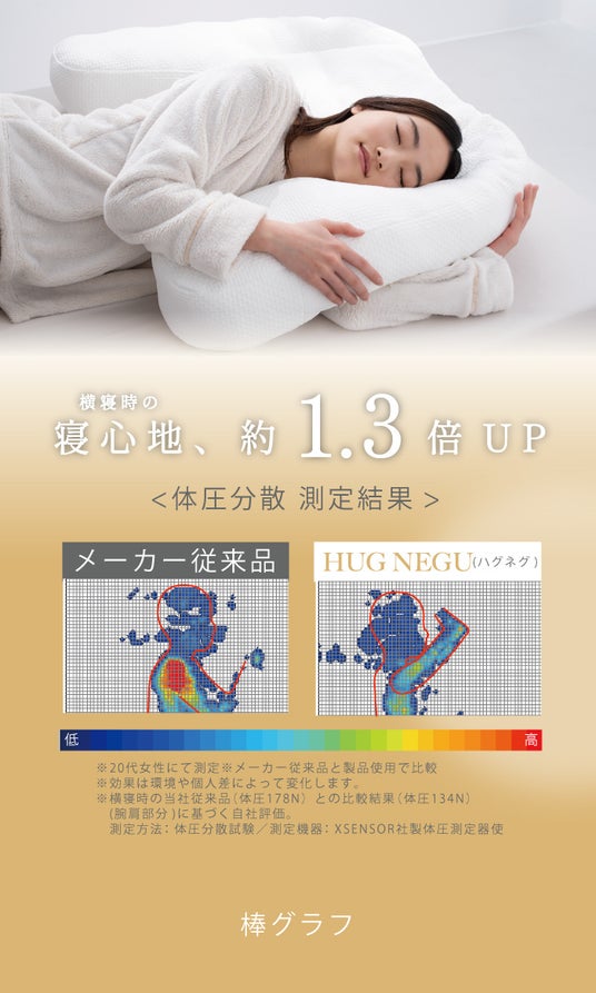 二階建て構造という下層部に空間を作ることで、横寝姿勢の腕や肩にかかる負担を軽減します。