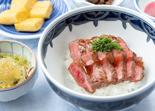 内容:サラダ・鉄板焼 出汁巻玉子・ステーキ丼・味噌椀・香の物