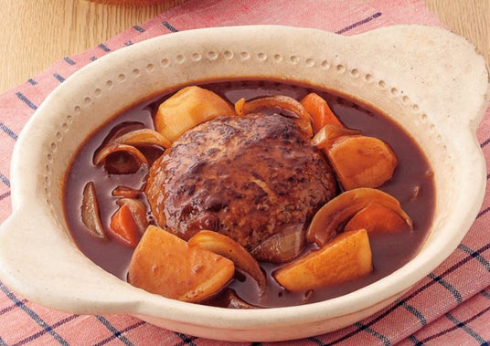 完熟トマトのペーストと炒めた玉葱の甘みを感じるデミグラスベースを加えて、コクのある手作りシチューハンバーグが完成!