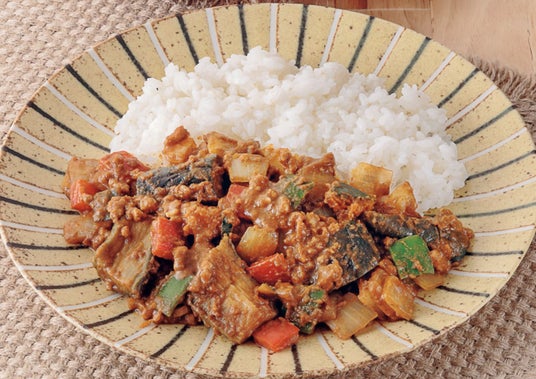 豚ひき肉、なす、かぼちゃが入ったカレーの素とカット野菜を使用!