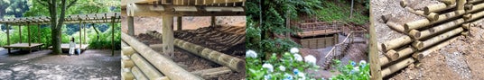 南沢あじさい山は、自然環境への負荷を最小限に抑えるため、東屋やデッキテラス、展望台から各種看板まで、構造物にコンクリート基礎を一切使用しない木製構造を採用します。公的機関の木杭実験で30年腐らなかった木材構造物(PARKS WOODS)を活用して地域の木材を積極活用し、自然景勝との調和を図りながら、生物多様性を尊重した取り組みをスタートさせています。