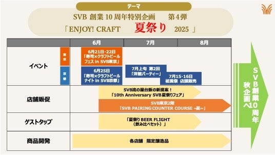 スプリングバレーブルワリー株式会社(社長 井本亜香、以下SVB)は、2025年6月21日(土)より創業10周年特別企画第4弾 「ENJOY! CRAFT 夏祭り 2025」を開催します。日本の”夏祭り”をテーマに、ものづくりに関わる人々との協同を通して、クラフトビールと日本の食文化の新たな魅力体験ができる企画を、スプリングバレーブルワリー東京(以下SVB東京)とスプリングバレーブルワリー京都(以下SVB京都)両店にて続々と展開します。