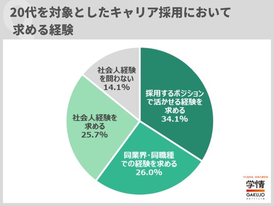 20代を対象にしたキャリア採用において求める経験については、「採用するポジションで活かせる経験を求める」が34.1%でトップ。2位の「同業界・同業種での経験を求める」26.0%を合わせると6割に上りました。「社会人経験を求める」は25.7%で、「社会人経験を問わない」は14.1%にとどまりました。一定程度の業務経験を重視する企業が多いことが分かります。