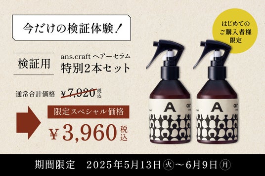 株式会社うれるや.さわやかが運営するヘアケアブランド「ans.craft(アンス.クラフト)」は、2025年5月13日(火)~6月9日(月)の期間中、看板商品「ヘアーセラム」をはじめてご購入いただく方に向けた"検証キャンペーン"を開催いたします。