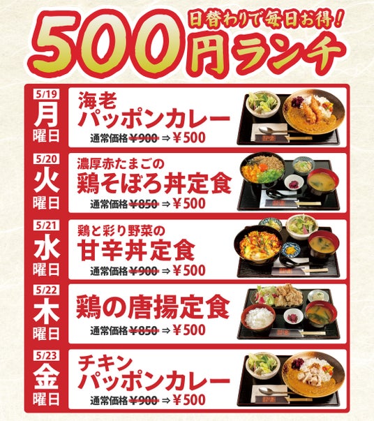 当店1番人気の「唐揚げ定食」や、タイ料理の玉子とじカレーをアレンジした「パッポンカレー」など、日替わりで対象メニューを500円にてご提供いたします。