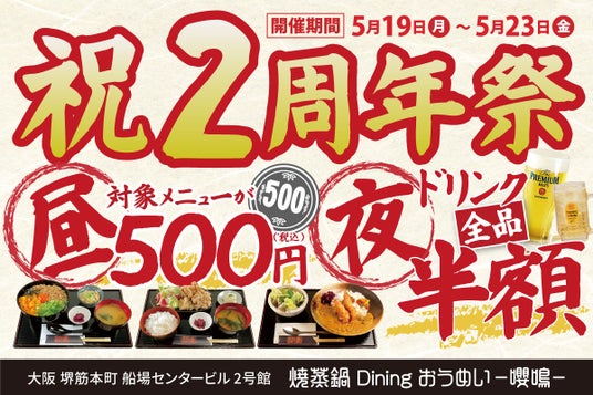 大阪・堺筋本町駅にある居酒屋『焼蒸鍋Dining おうめい-嚶鳴-』は、2025年5月16日にオープン2周年を迎えます。これを記念し、日頃のご愛顧に感謝を込めた「2周年祭」を、5月19日(月)~5月23日(金)の5日間限定で開催いたします。