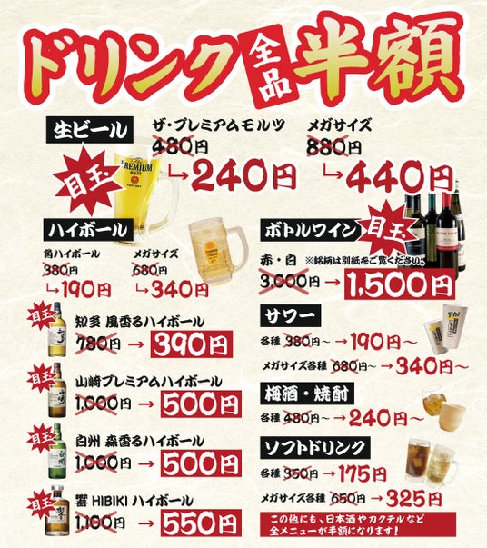 ビール、ハイボール、サワー、焼酎、ボトルワインまで、店内全てのドリンクが半額に!