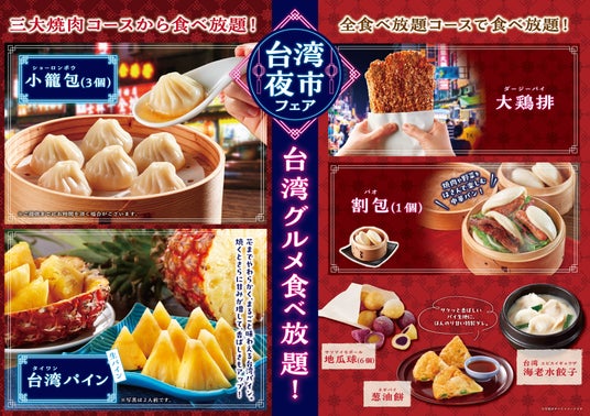 カルビ一丁で初の試みとなる「台湾夜市フェア」は、台湾の人気グルメである小籠包をはじめ、大鶏排(ダージーパイ)や割包(パオ)、台湾パインなど普段あまり口にすることのない異国の料理を美味しい焼肉とともに食べ放題で楽しめる特別企画です。