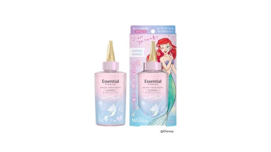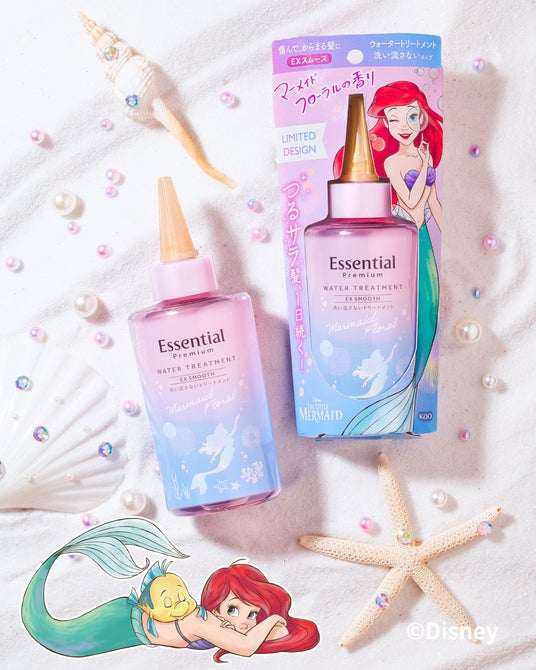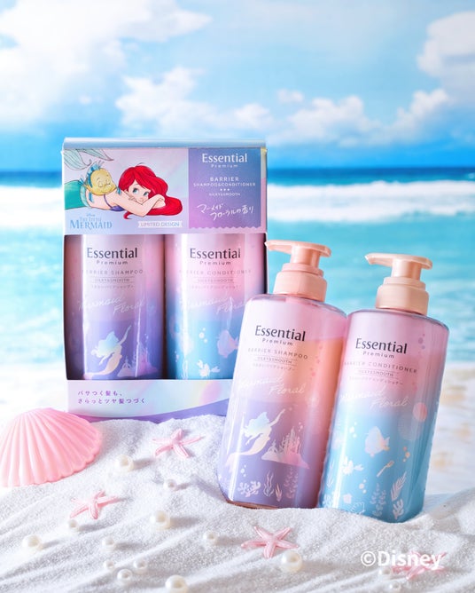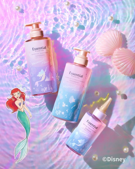 商品ラインアップは、美容のプロにも受け入れ性の高いこだわりの成分が好評の『エッセンシャル プレミアム バリアシャンプー・コンディショナー シルキー&スムース』ペアセットと、「#マーメイド髪水」の愛称で話題となった、ドライヤー速乾効果と感動的な指どおりが特長の『エッセンシャル プレミアム ウォータートリートメント EXスムース』です。「#マーメイド髪水」は、アリエルの世界観とぴったりマッチします。