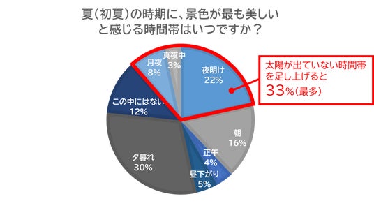 夏の特定の時間帯における景色の美しさに関するアンケートでは、「夕暮れ」(30%)という回答が最も多く、次いで「夜明け」(22%)でした。また、「月夜」・「真夜中」・「夜明け」といった「太陽が出ていない時間帯」を足し上げると33%に達し、第一位の「夕暮れ」を超える結果になりました。