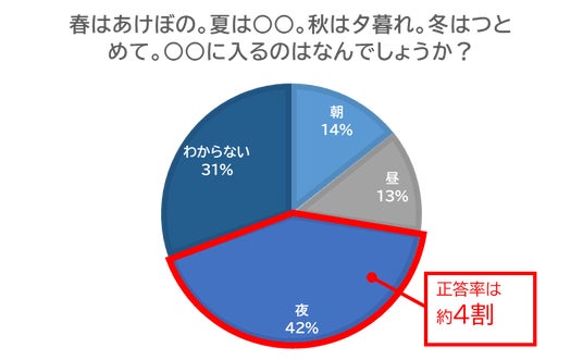 清少納言の『枕草子』より「春はあけぼの。夏は○○。秋は夕暮れ。冬はつとめて。○○に入るのはなんでしょうか?」という問いに対して、「夏は夜。」の「夜」の部分の正答率は42%に留まりました。小学生の国語の教科書にも登場する『枕草子』ですが、記憶が薄れている方も多いのかもしれません。