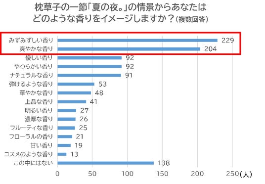 「『枕草子』では、夏の夜に月が出ていたり、闇の中で蛍が飛んでいること、また、雨が降っているのもよい、と謳っていましたが、その情景からあなたがイメージする「香り」はどのような香りをイメージしますか?」という問いに対しては、「みずみずしい香り」が最多で、次いで、「爽やかな香り」という結果になりました。