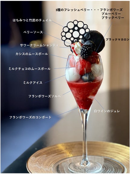 フランボワーズの甘酸っぱさに、ブラックベリーとブルーベリーの奥深い味わいが重なり、可憐さの中にほんのりスパイスを効かせた “小悪魔のように魅惑的なベリーパフェ” 。