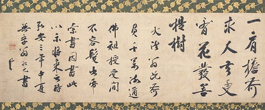 中国僧 無学祖元(むがくそげん)が、日本僧 一翁院豪(いちおういんごう)に、自らの教えを正しく受け継いだ証として法衣を授けたことを、宗教的な詩である偈に詠んだもの。中国・宋時代の書風を伝え、無学の遺墨のなかでも優品である。