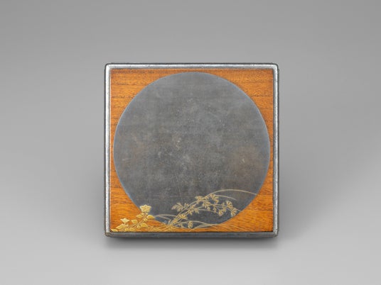蓋表に平蒔絵で大胆に配された大きな満月と繊細な秋草。内に収まる茶碗の銘にふさわしい、武蔵野を象徴する意匠である。