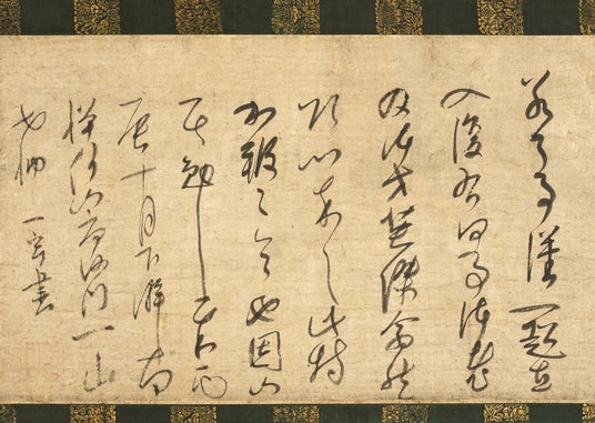 中国僧の一山一寧(いちざんいちねい)が、京都・南禅寺の住持をつとめていた際、日本僧の固山一鞏(こざんいっきょう)に与えた1幅。一山は、より一層修行に励むようにと、固山を鼓舞した。流れるようによどみなく書かれた、見応えのある草書である。