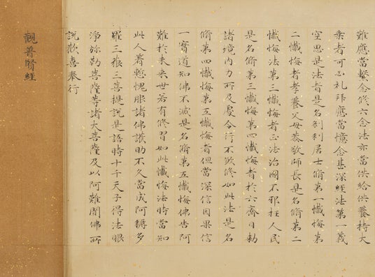 写経は、6世紀の仏教伝来以来、今日まで連綿と続く営みです。奈良時代には、専門の写経生たちが謹厳で端正な書風を残しています。また、平安貴族たちが功徳を求めて作らせた壮麗な写経の遺品からは、その料紙装飾や書風を通じて当時の美意識を知ることができます。