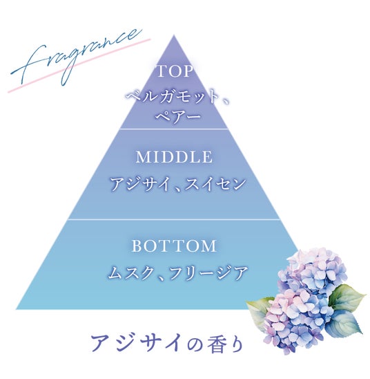 紫陽花やスイセンのほんのりと甘いフローラルをメインに、上品で優しいムスクとフリージアが香り立ちます。