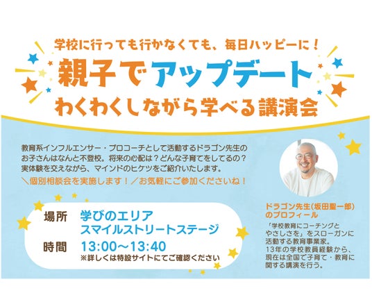 この度、「笑顔が集まる街」をテーマに、地域住民と共に未来を創る、群馬県前橋市で行われるイベント「スマイルキャンパス2025」において、当社代表の坂田聖一郎(通称:ドラゴン先生)が不登校に悩む親子に向けて、ステージ講演およびブースでの個別相談を実施します。