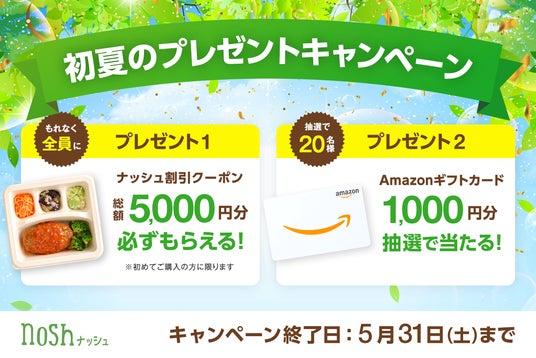 「世界中の人々が健康で豊かに生活できる未来を届ける。」をミッションに掲げ、手軽に美味しく栄養管理ができる冷凍宅配食サービス「nosh(ナッシュ)」を提供するナッシュ株式会社(本社:大阪市、代表取締役:田中 智也)は、2025年5月13日(火)から5月31日(土)までの間、新規ご購入のお客様を対象に総額5,000円分の割引クーポン(※)をプレゼントするほか、Amazonギフトカード1,000円分が抽選で20名様に当たる「初夏のプレゼントキャンペーン」を開催します。
