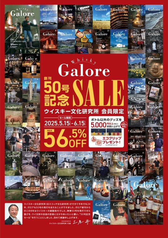 株式会社ウイスキー文化研究所(所在地:東京都渋谷区、代表取締役:土屋守)は、日本で唯一定期刊行されているウイスキー専門誌『Whisky Galore(ウイスキーガロア)』6月号(Vol.50)を2025年5月12日に発売します。創刊50号を記念し、ウイスキー文化研究所会員の皆様限定でセールを行います。セール期間は5月15日(木)~6月15日(日)となっております。