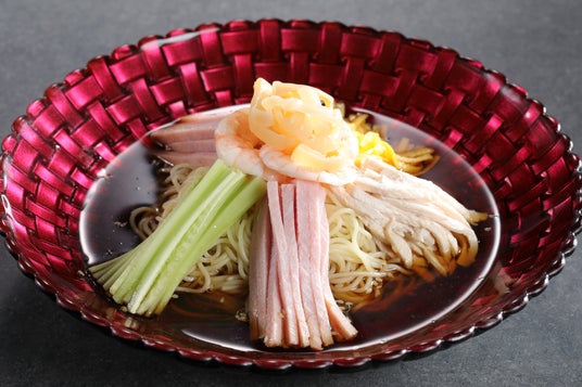 醤油ベースの出汁でお召し上がりいただく、シンプルな冷麺。トッピングは焼豚、蒸し鶏、くらげ、海老、ハム、玉子、きゅうりを盛り付けました。暑い夏の日にさっぱりとお召し上がりいただけます。