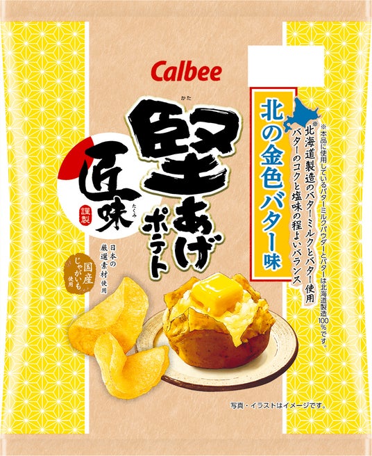 カルビー株式会社(本社:東京都千代田区、代表取締役社長: 江原 信)は、“噛むほどうまい!”堅い食感が人気のポテトチップス「堅あげポテト」から、贅沢な和の味わいを追求した「匠味(たくみ)」シリーズの『堅あげポテト匠味 北の金色バター味』を2025年5月19日(月)から全国のコンビニエンスストアで期間限定発売します(2025年6月下旬終売予定)。