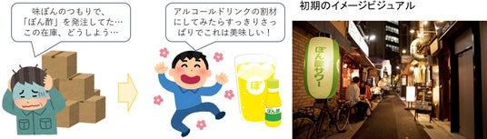 ミツカンでは、社長から直接「年間1,000万円を自由に使って良い予算として渡すから、何か会社にとって面白いこと、新しいことを見つけてきなさい」とミッションを受けた若手社員がぽん酢サワーの話題に気付き、「提灯が光る下町の居酒屋で、みんながぽん酢サワーを楽しんでいる」というイメージのビジュアルを作って経営層を説得したことから、全社的なプロジェクトとして取組みがスタートしました。