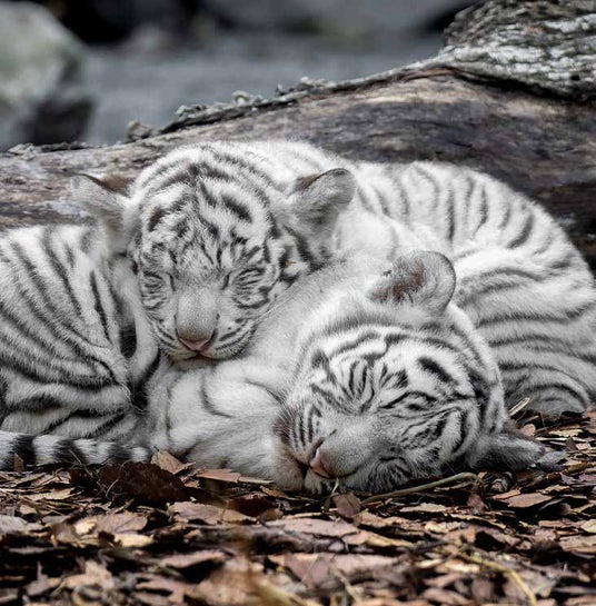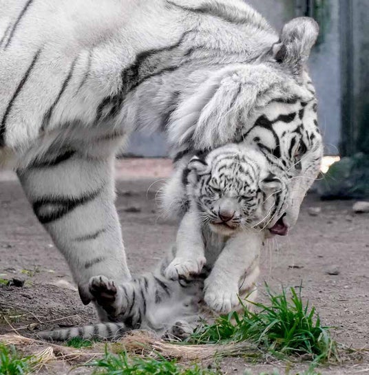 ホワイトタイガーは野生ではほとんど見られない希少な生き物で、インドでは「神の化身」という伝説もあることから、赤ちゃんたちを献身的にお世話する母トラ「シロップ」に「神々しい」「まさに神の化身」といった声も寄せられています。
