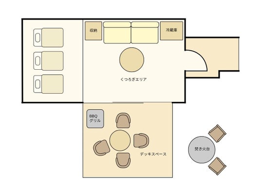 全キャビンのウッドデッキで焚き火が楽しめます。