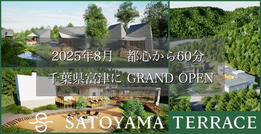 株式会社アミナコレクション(本社:神奈川県横浜市、代表取締役社長:進藤さわと)は、千葉県富津市に、自然との調和の中で贅沢なひとときを過ごせるグランピング施設「SATOYAMA TERRACE (里山テラス) 」を2025年夏※に開業いたします。この度、宿泊予約サイトを開設し、予約受付を開始しました。引き続きクラウドファンディングでのご支援も受付中です。