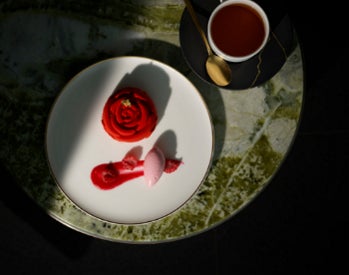 横浜の市花・バラをモチーフにした、チョコレートとラズベリーの3周年記念ケーキをご用意しました。華やかなケーキに、ライチのソルベとライチティーを添えてご提供いたします。