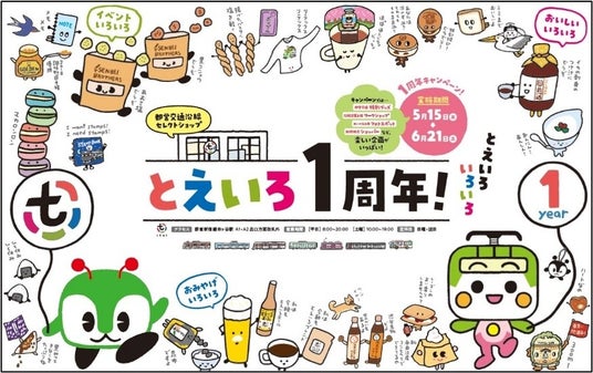 このたび、令和7年5月15日(木)にオープン1周年を迎えることを記念して、さまざまな特別企画(店舗の装飾、沿線企業の催事・商品販売、都営交通新作グッズ販売等)を実施いたします。この機会に、ぜひ「とえいろ」にお越しください。